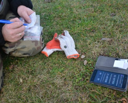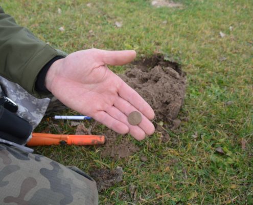 27 października i 4 listopada łącznie 32 detektorystów przeprowadziło poszukiwania śladów walk z I i II Wojnie Światowej oraz pozostałości po kolejce wąskotorowej wzdłuż drogi Ostrołęka – Myszyniec. Podczas badań terenu odnaleźliśmy liczne łuski i odłamki świadczące o walkach na tym terenie, a także przedmioty z lat wcześniejszych takie jak np. monety i medaliki oraz elementy metalowe związane z kolejką wąskotorową m.in. gwoździe i śruby mocujące szyny do podkładów kolejowych.