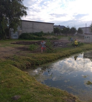 Na początku zbudowaliśmy kładkę, żeby można przechodzić na drugą część stawu. Następnie nawieźliśmy ziemię i wyrównaliśmy teren. Kolejnym etapem było skoszenie placu przy stawie, podcięcie gałęzi drzew. Przy okazji prowadzenia naszych prac odkryliśmy piękny pomnik przyrody, jakim są drzewa, które zrosły się wspólną gałęzią.
