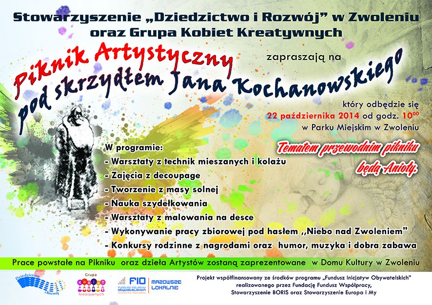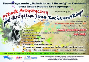 W najbliższą środę, 22 października 2014 roku, w Parku Miejskim w Zwoleniu będzie kolorowo, twórczo i kreatywnie. Na „Piknik Artystyczny pod skrzydłem Jana Kochanowskiego” zapraszają organizatorki – Grupa Kobiet Kreatywnych już od godziny 10:00. W ramach Pikniku odbędą się warsztaty z technik mieszanych i kolażu, zajęcia z decoupagu oraz liczne zabawy dla małych i nieco starszych uczestników.