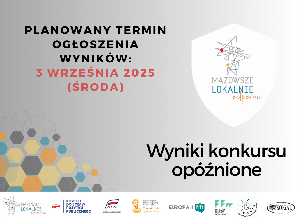 Z uwagi na bardzo dużą liczbę złożonych wniosków oraz konieczność wydłużenia czasu na rzetelną ocenę, publikacja wyników konkursu została przesunięta.