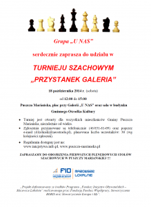 Grupa U NAS zaprasza na finał swojego projektu – Turniej Szachowy Przystanek Galeria, który odbędzie się 18 października (sobota) w godzinach 12:00-15:00 na placu przed Galerią w Puszczy Mariańskiej oraz sali Gminnego Ośrodka Kultury.  Zgłoszenia przyjmowane są mejlowo (d.kolinski@neostrada.pl) i telefonicznie (46 831 81 09). Ilość miejsc ograniczona!
